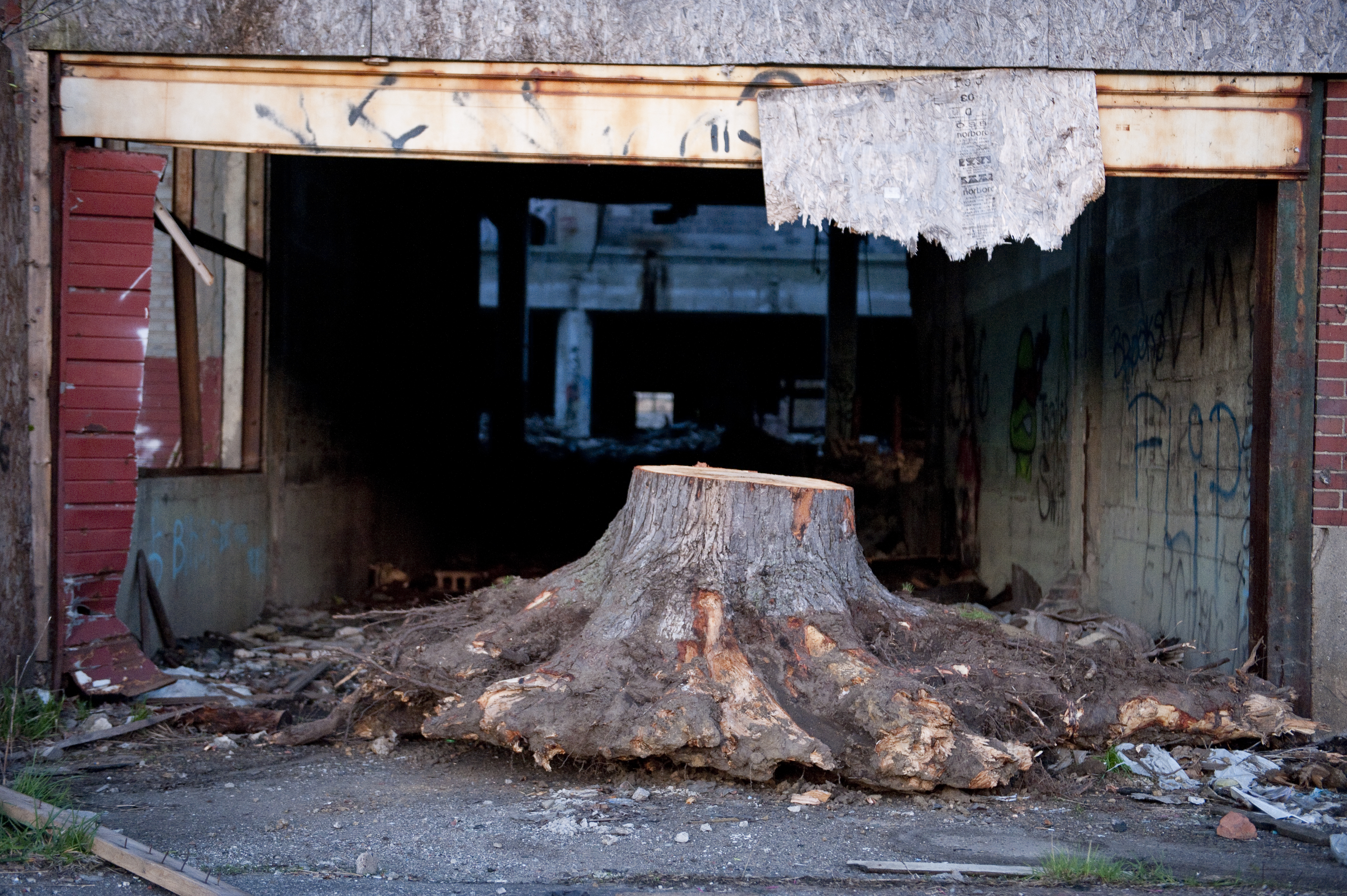 (Photo: A tree stump sits among the ruins of the Packard Automotive Plant, a 35 acre site where luxury cars were manufactured until the 1950’s on May 2, 2013 in Detroit, Michigan. Sitting on the East side of Detroit, the former automotive plant is now a site for scavengers, urban explorers and graffiti artists. By Ann Hermes/The Christian Science Monitor via Getty Images.)