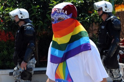 A masked participant of the first gay pride parade is protected by Montenego riot police on July 24, 2013 in Budva. More than 100 anti-gay protestors, mostly young hardline football fans, chanted “Kill the gays!” while throwing stones and bottles towards several dozen gay activists secured by a police cordon in the historic centre of the coastal town Budva. AFP PHOTO / SAVO PRELEVIC (Photo credit should read SAVO PRELEVIC/AFP/Getty Images)