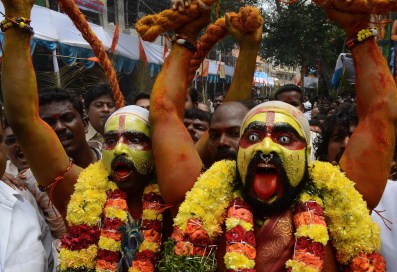 Indian Hindu devotees representing Potharaju, brother of the goddess Mahankali, dance in the streets during the Bonalu festival at the Sri Ujjaini Mahakali Temple in Secunderabad, the twin city of Hyderabad, on July 29, 2013. The Goddess Kali is honoured mostly by women during Bonalu festival by offerings of food and dancing.AFP PHOTO/ Noah SEELAM (Photo credit should read NOAH SEELAM/AFP/Getty Images)