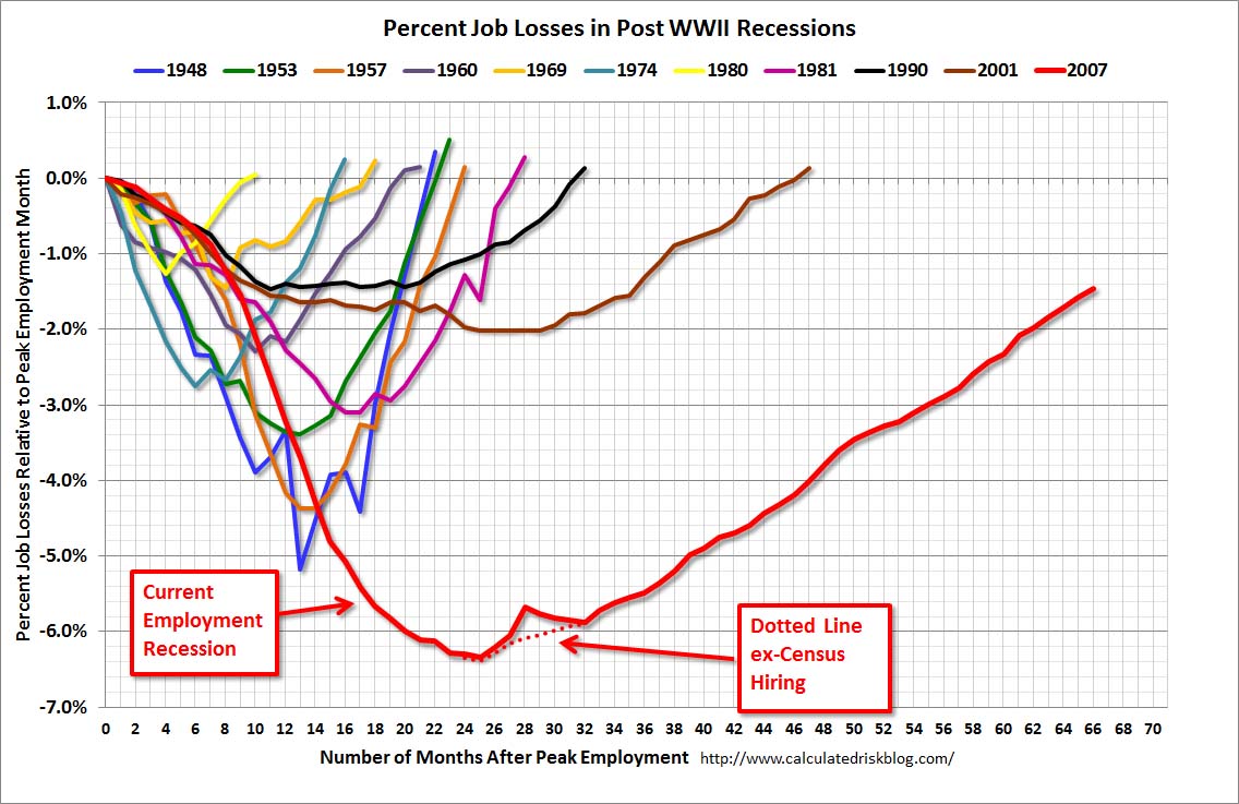 This shows the depth of the recent employment recession – worse than any other post-war recession – and the relatively slow recovery due to the lingering effects of the housing bust and financial crisis.