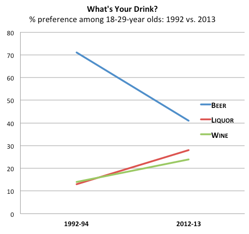 According to a 2011 working paper by the American Association of Wine Economists, the global volume of beer in the 1960s was twice that of wine. As of 2005, beer consumption (153 billion liters) was six times that of wine (24 billion liters). In financial sums, beer is vastly ahead; the authors state that the beer industry accounts for an estimated 130 billion U.S. dollars, while the wine industry brings in around 65 billion.