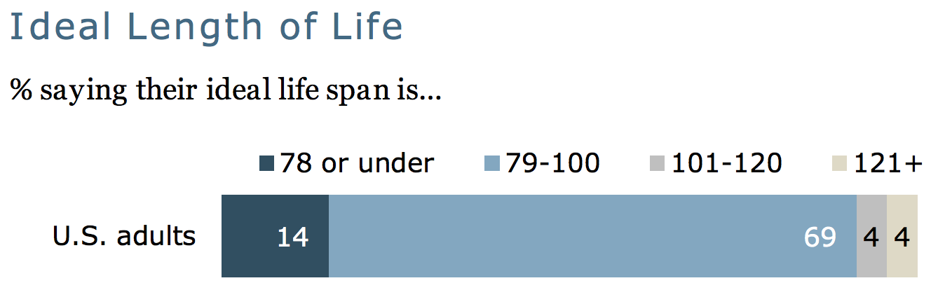 People don’t want to live past the age at which severe diseases and disabilities are expected. When respondents are asked how long they’d like to live, fewer than 10 percent choose 100 or older. Twenty percent want to live into their 90s. Thirty-two percent want to live into their 80s. Thirty percent don’t want to make it past 80. Why do most people want to die before they reach 90? Probably because being 90 sucks. But that’s true only because of the current rate of physical decline.