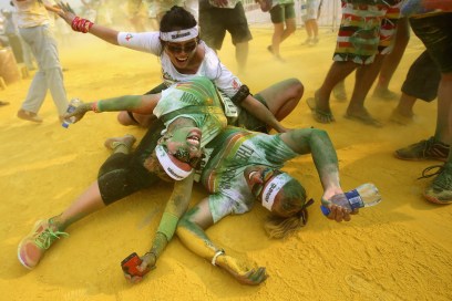 Competitors run through the XXX colour throw area during the Colour Run at the Beijing International Garden Expo park on August 10, 2013 in Beijing, China. It’s the first time China hosts this event.