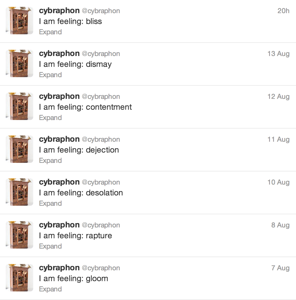 Cybraphon has its own social media account and regularly tweets updates about its own moods.