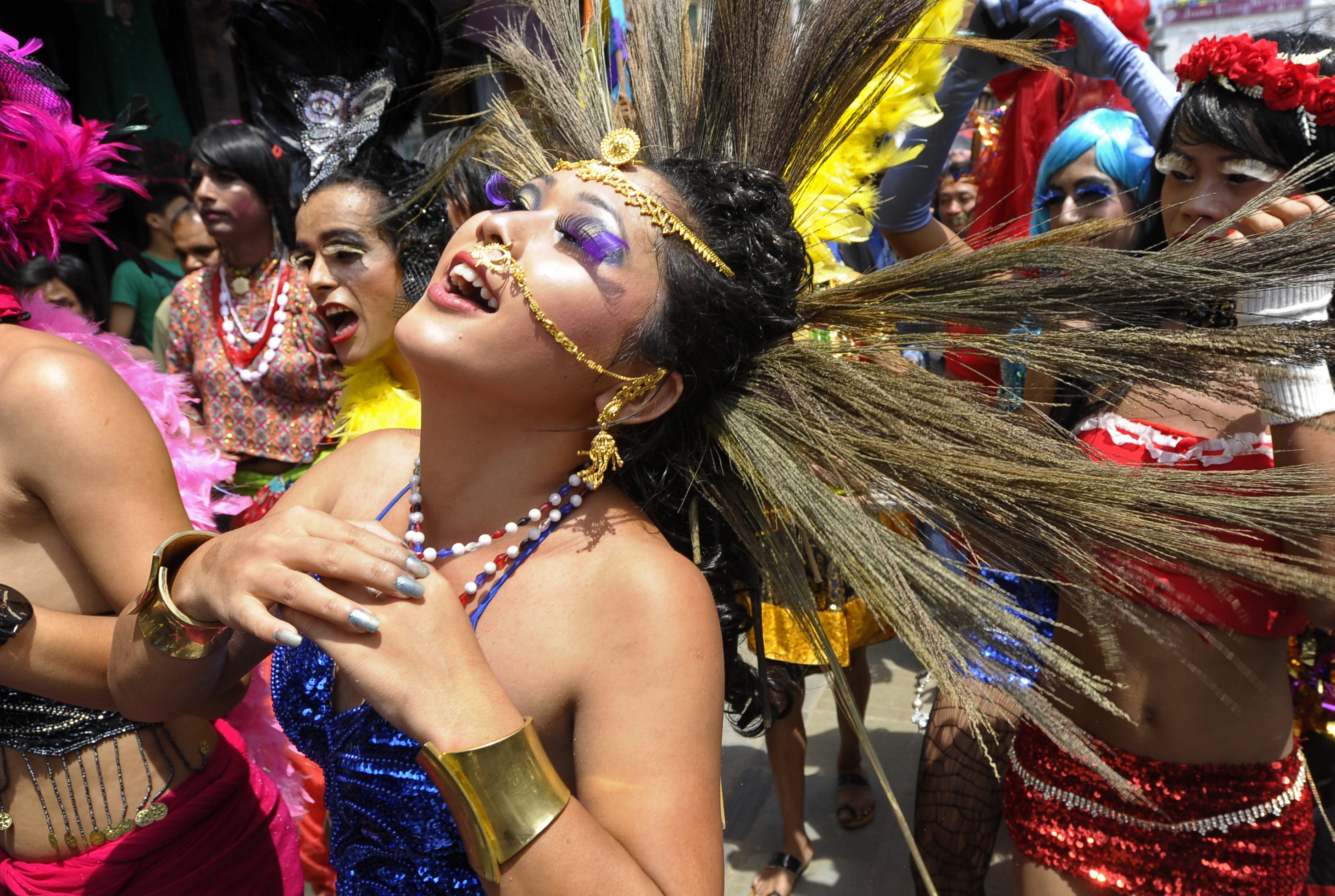 Participants dance during Nepal’s 4th International Gay Pride parade in Kathmandu on August 22, 2013. Scores of gays, lesbians, transvestites and transsexuals from across the country took part in the rally to spread their campaign for sexual rights. By Prakash Mathema/AFP/Getty Images.