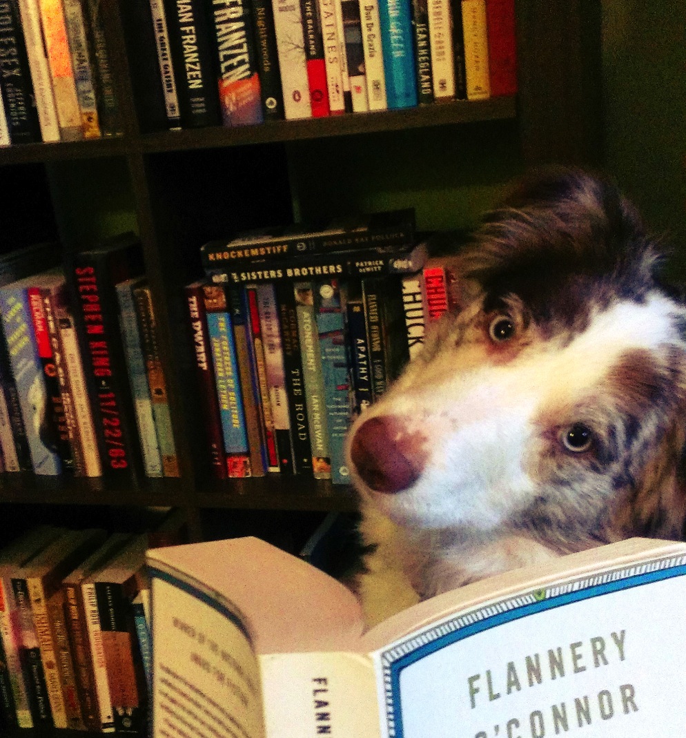 From the new tumbr Book Shelfies, an exercise in literary narcissism. Naturally we had to go with the canine stand-in: