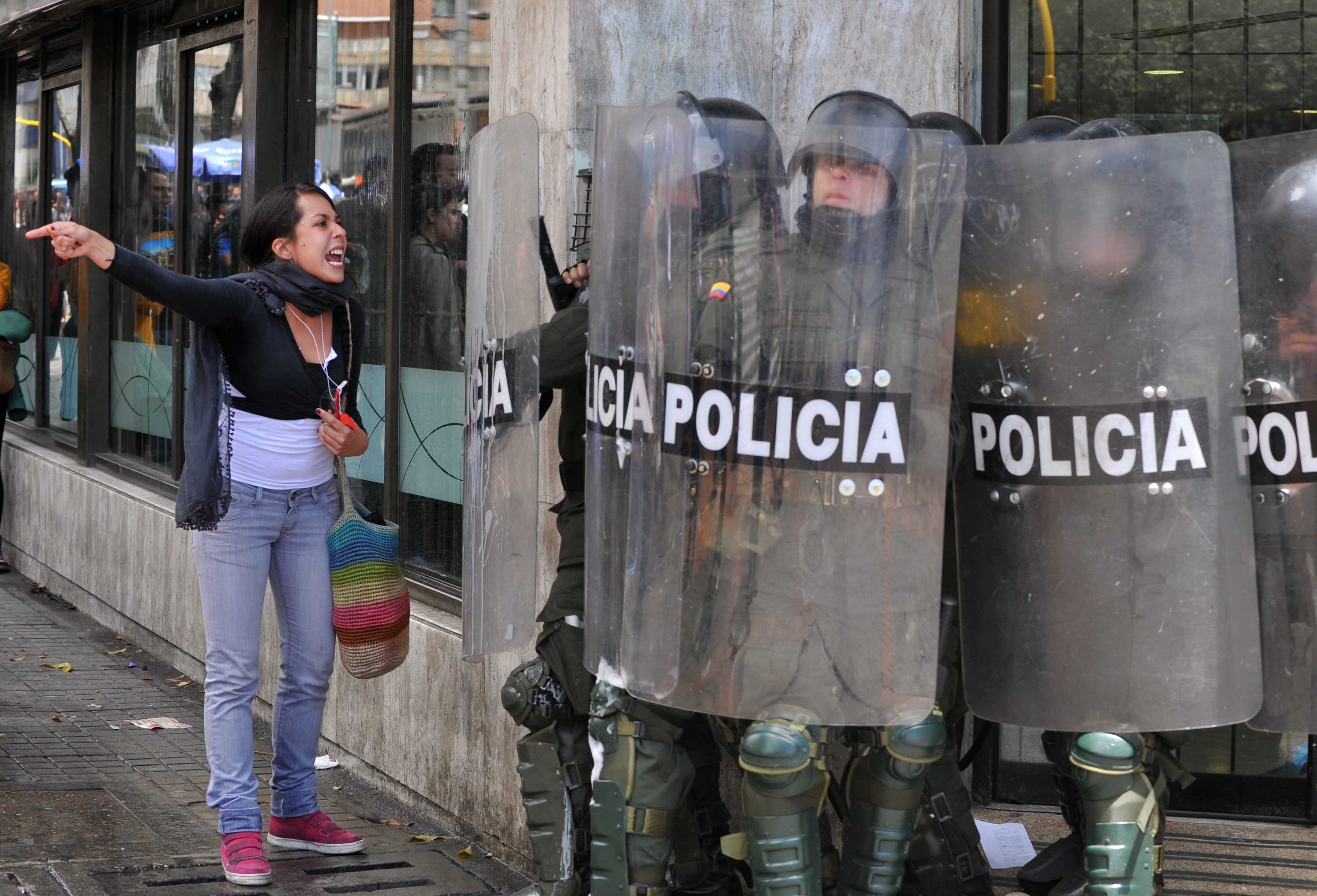 A demonstrator shouts at the riot police during clashes that erupted after a march in support of Colombian farmers protesting in demand of government subsidies and greater access to land, in Bogota on August 29, 2013. Backed by the Revolutionary Armed Forces of Colombia (FARC), the country’s largest leftist guerrilla group, farmworkers called the open-ended protest to demand government subsidies for certain agricultural products and lower prices for inputs like seed and fertilizer. Protesters also are seeking guarantees on access to land, special land preserves for poor farmers, policies in support of traditional miners, improved delivery of healthcare, and potable water in rural areas. By Guillermo Legaria/AFP/Getty Images.