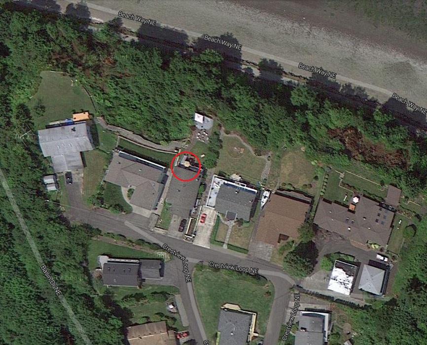 Then, noting the staircase, the neighbor’s white fence, and the hint of a gray gravel path bordered by shrubbery on the other side of that fence, I concluded that the photo was taken from the northern end of the house at 5534 Crestview Loop NE, Olympia/Lacey, Washington, USA 98516. In case the house number is incorrect (although both Google Maps and MapQuest agree on it), in the lineup of six waterfront homes along Crestview Loop, the VFYW home is the third from the left (West) end. Furthermore, both Olympia and Lacey seem to be valid city addresses for the location. I lack the skills to capture a picture with an arrow pointing to the house, so my description will have to suffice.