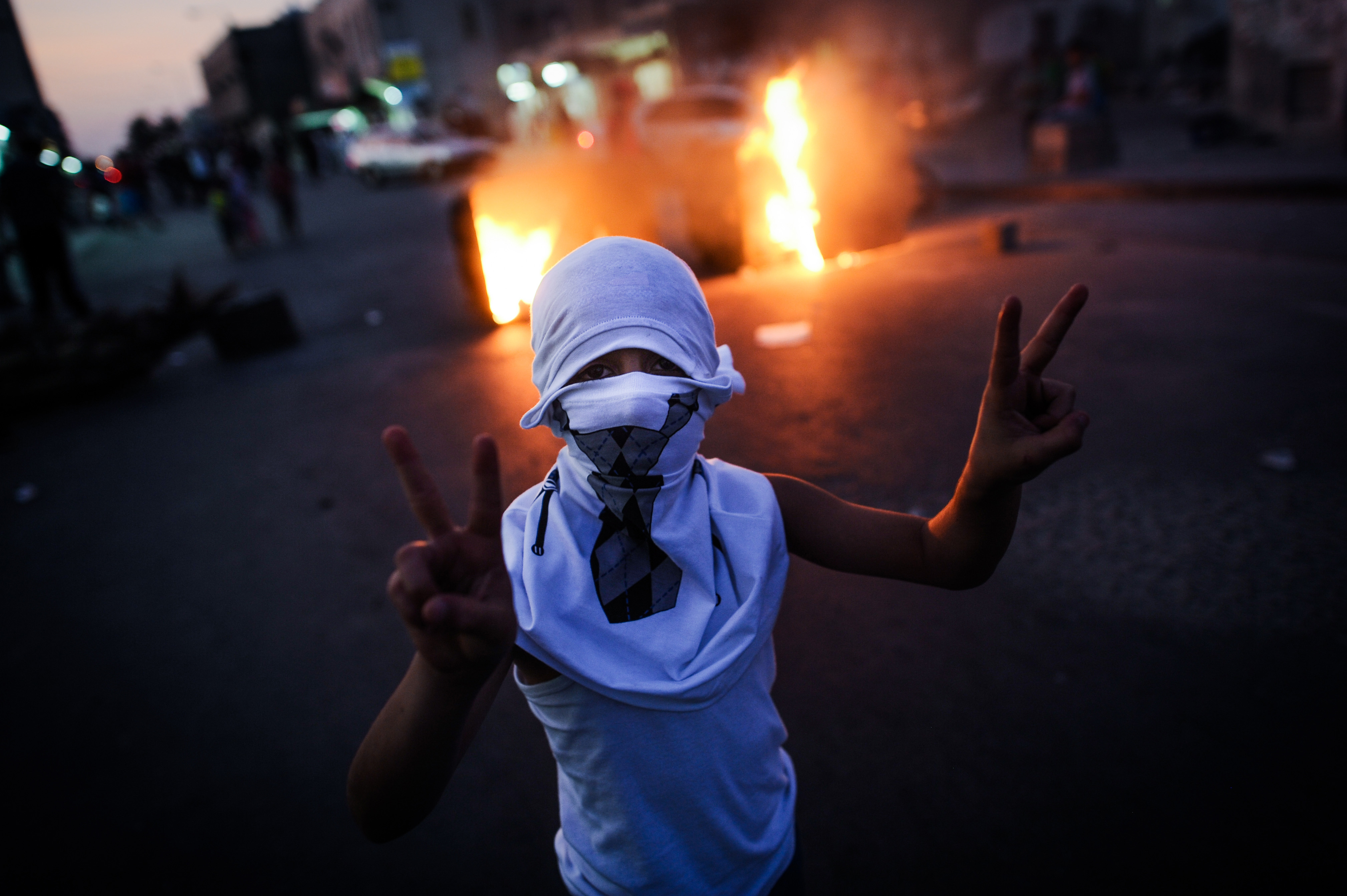 A Bahraini boy flashes the v-sign during the funeral of 10-year-old Ali Jaffer Habib, in the village of Malikiya, on August 10, 2013. Habib, according to his family, died after developing cancer due to the inhalation of tear gas fired by security forces earlier in the year. By Mohammed Al-Shaikh/AFP/Getty.