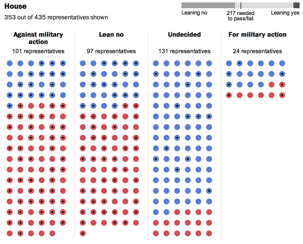 The Fix is keeping track of Congressional supporters and opponents of intervention in Syria. The above numbers from the House include only 353 of the House’s 435 members because not every representative has made a statement yet: