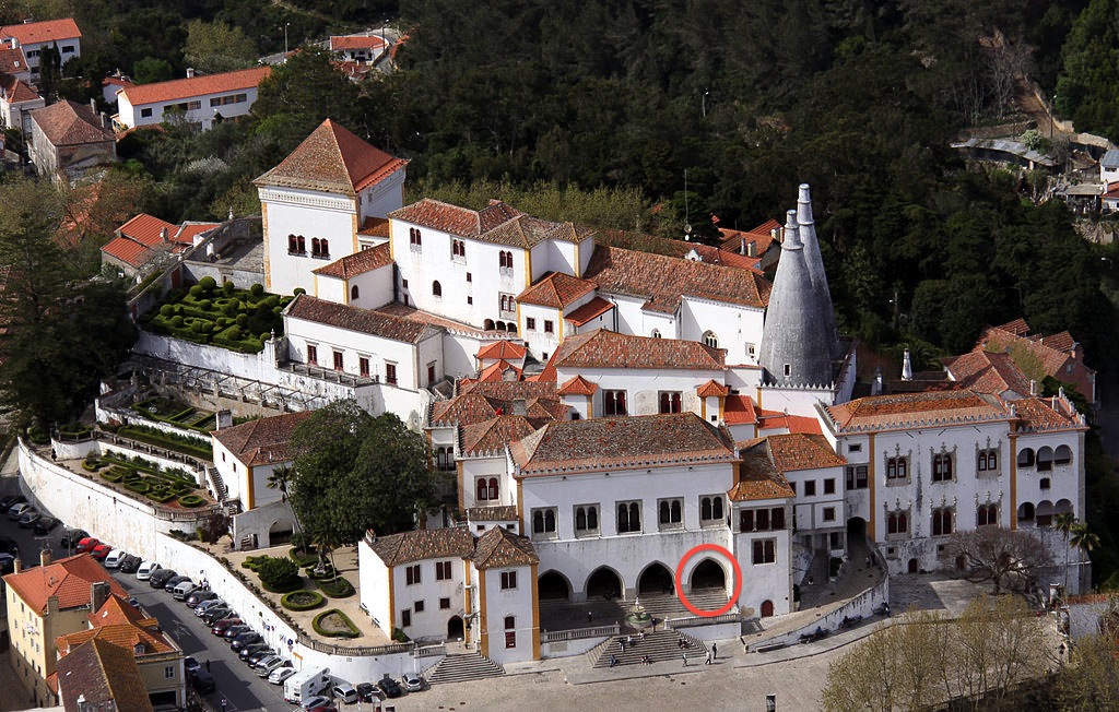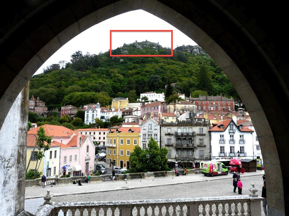So we’re looking at a castle above Sintra, Portugal, meaning we are IN Sintra. Given the layout of the foreground of the contest photo, there’s only one option for the location, and that’s the Sintra National Palace. There are four large arches on the front of the palace, but given the location of the little fence in front, we are looking out of the left-most arch, or the right-most if you’re facing the building.