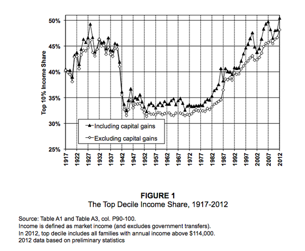 You can see that in 2012, top 10 percent income share creeps above 50 percent for the first time … Senior Brookings Institution fellow Justin Wolfers notes from the study that in the years since the crash (2009-2012), the average income of the top one percent has risen 31.4 percent, while the average income of the other 99 percent has risen only 0.4 percent.