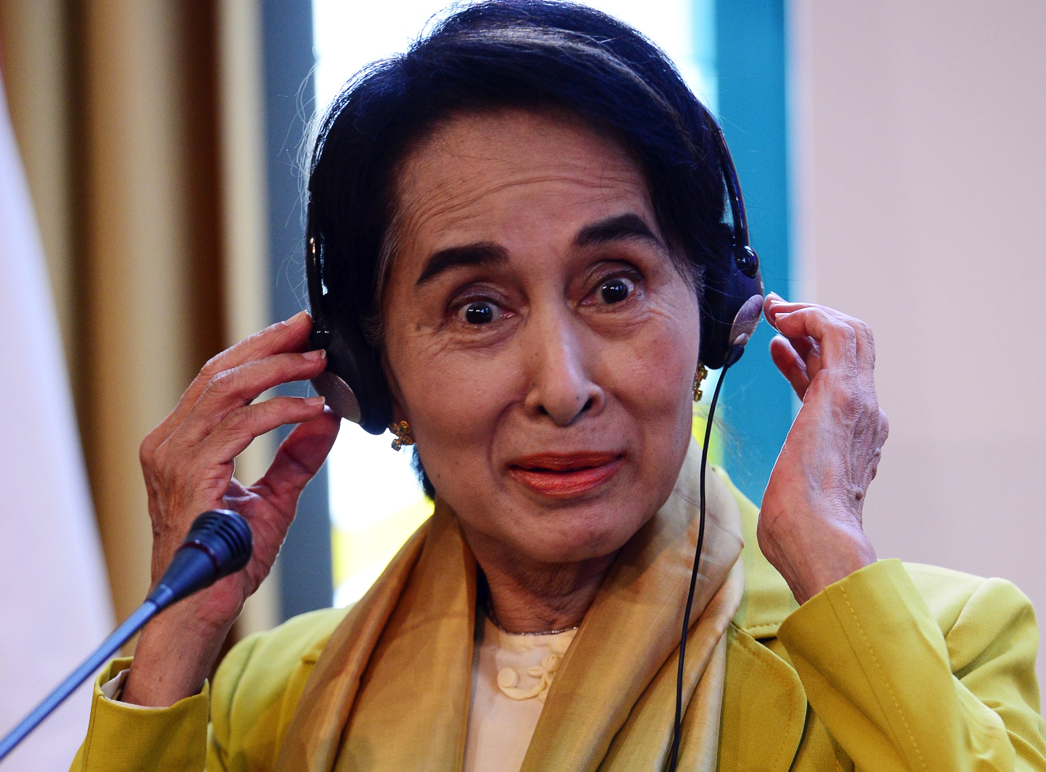 Myanmar’s opposition leader Aung San Suu Kyi listens to a journalist’s question during the conference hall of the Hungarian foreign ministry in Budapest during her international press conference on September 13, 2013. The Nobel Peace prize-winning guest is on her second station of her visit for three eastern European countries, Poland, Hungary and Czech Republic. By Attila Kisbenedek/AFP/Getty Images.