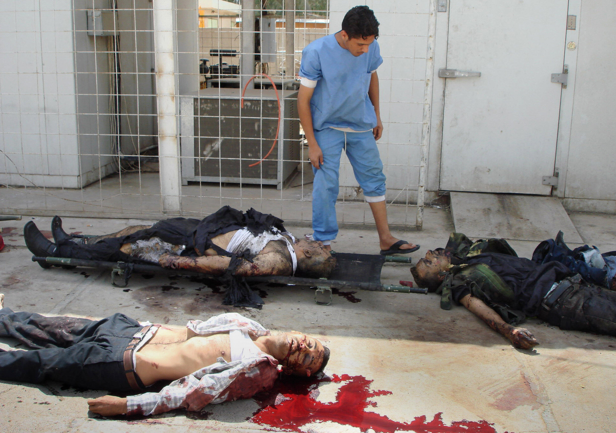 (Photo: An Iraqi hospital worker inspects burned bodies outside the morgue of a hospital in the restive Iraqi city of Baquba, northeast of Baghdad, 23 April 2007. The victims were killed when a bomber exploded his car near the city council building, killing four policemen, police Lieutenant Ahmed Ali from Baquba said. The attack wounded another 25 people, many of them policemen, he added. By Ali Tueijri/AFP/Getty Images.)