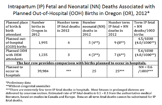 Home-birth is every bit as dangerous as Laura Helmuth expected. The most comprehensive figures to date were collected by the state of Oregon, when home-birth midwives refused to release their death rates to the state. Oregon asked Judith Rooks, a certified nurse-midwife, to analyze the data, and what she found was appalling. The death rate from planned home-births with a licensed Oregon home-birth midwife was 800% higher than comparable risk hospital birth. Below is the chart that she included in her testimony before the Oregon legislature:
