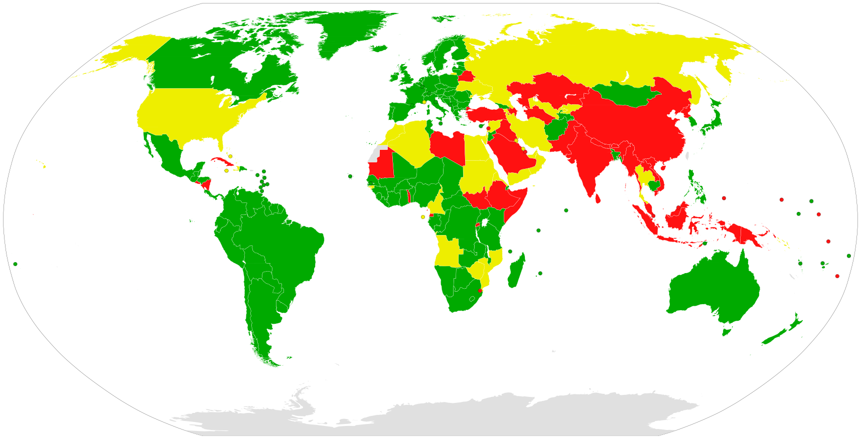 The map seen above, from Wikipedia, shows countries belonging to the ICC (green), countries that have signed but not ratified (yellow), and countries that have not signed (red).