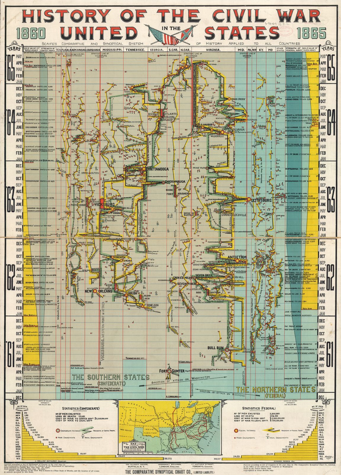 Rebecca Onion passes along the above chart, which “depicts major battles, troop losses, skirmishes, and other events in the American Civil War.” She focuses on a few parts: