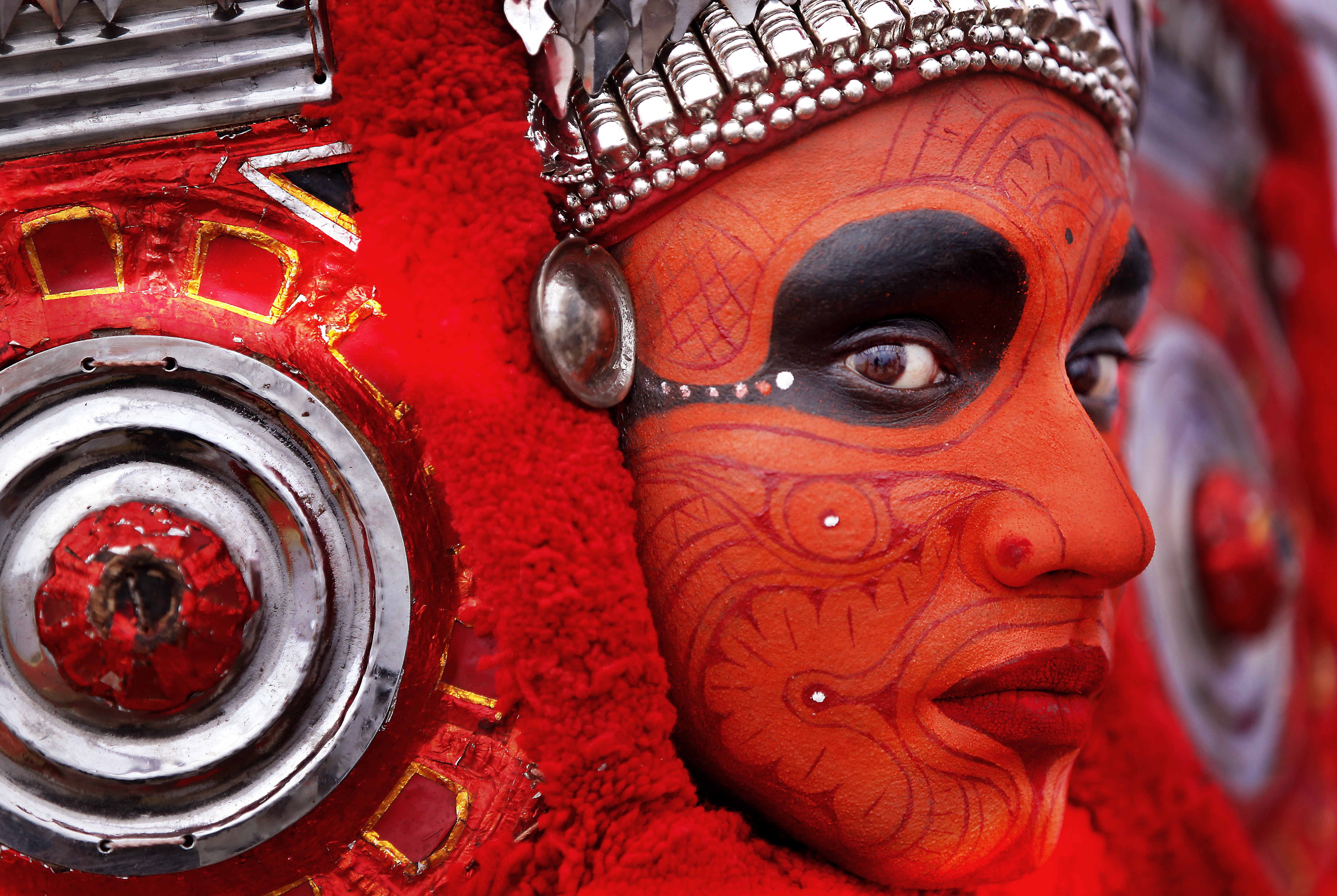 A Theyyam dancer getting ready for Onam Celebrations at Kerala Bhawan in New Delhi, India. Theyyam or Theyyattam is popular folk dance performed in North Malabar region of Kerala. People of these districts consider Theyyam itself a God and they seek blessings from this Theyyam. By Raj K Raj/Hindustan Times via Getty Images.