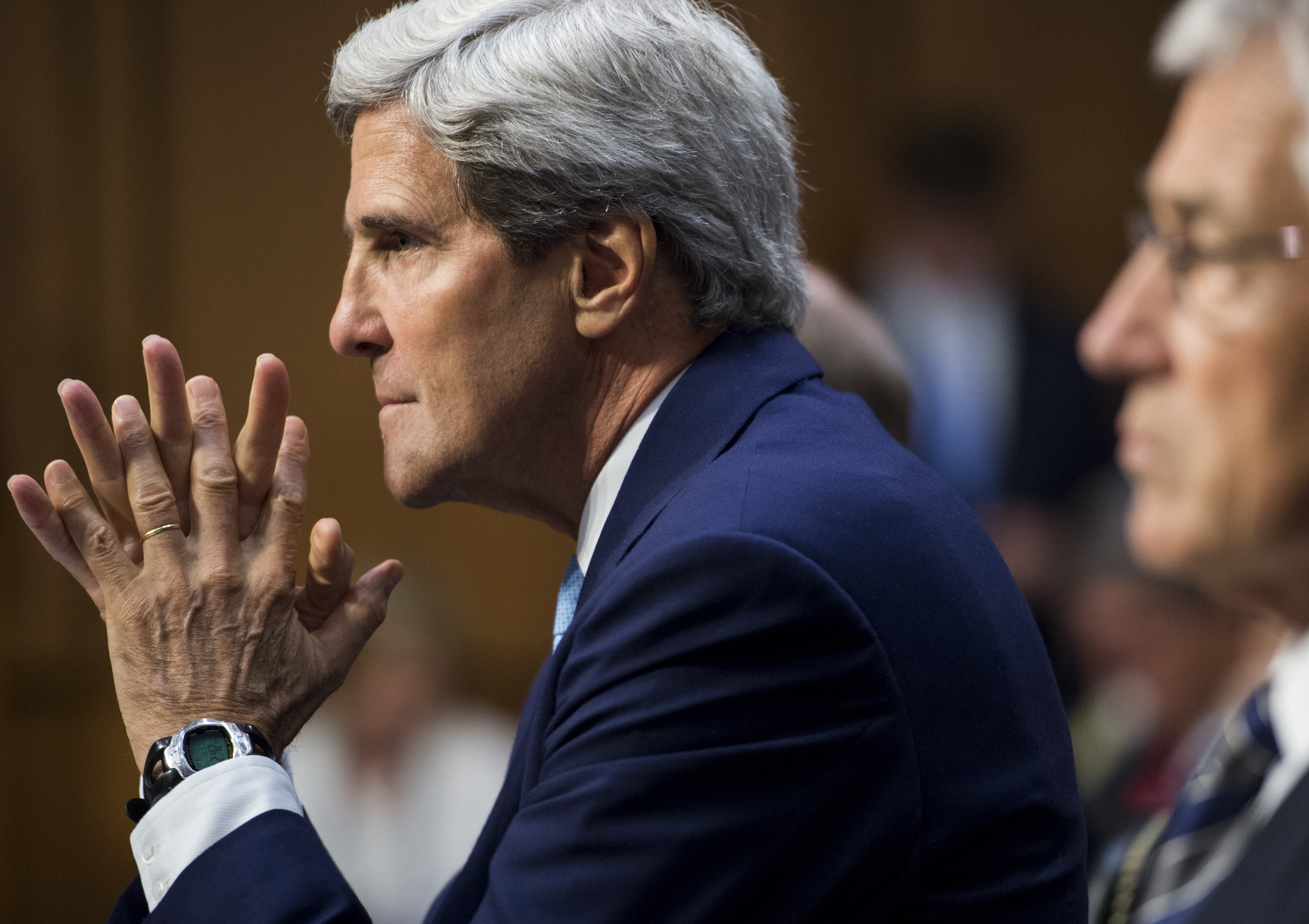 Secretary of State John Kerry and Secretary of Defense Chuck Hagel listen to Senators speak during the Senate Foreign Relations hearing to debate the authorization for use of military force in Syria on Tuesday, September 3, 2013. By Bill Clark/CQ Roll Call.
