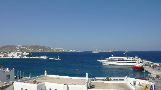 The view is of the Old Port above what looks to be the bus and boat terminal. A little google-fu tells me this is the Porto Mykonos Hotel. This picture from Room 128 seems pretty close: