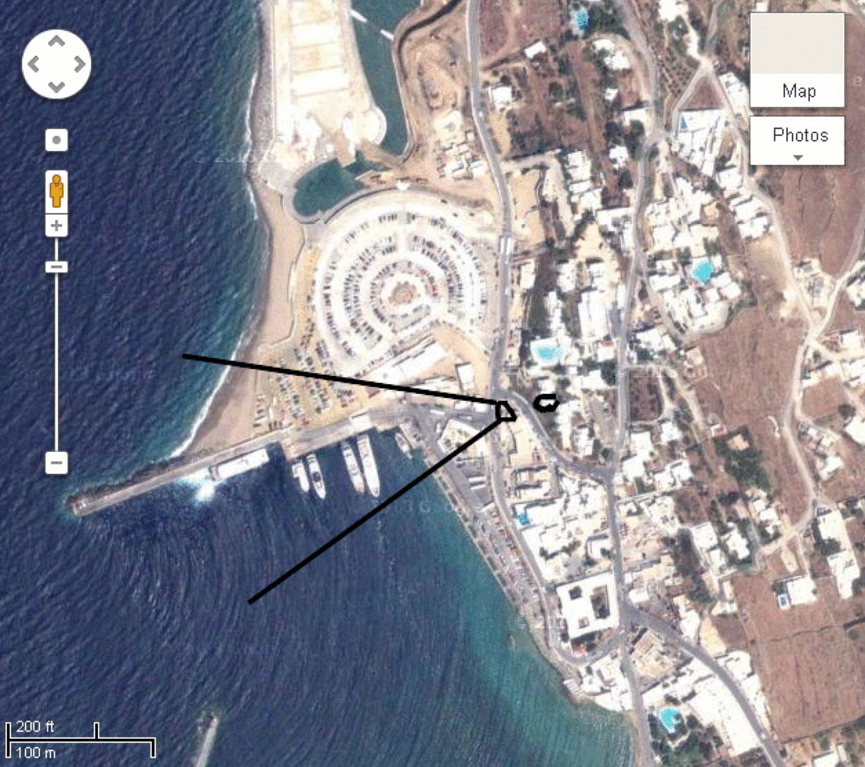 I used to enter this contest a dozen times and never got any where (with the exception of Boston, my hometown – but so did a million other people). I once correctly guessed Hastings-On-Hudson without having been there, but never entered the contest. I’m pretty convinced about this one: Mykonos Greece. I’ve added a Google maps satellite picture with all the elements in place; the open air enclosure; the trees along the street; the dive that zigs at the end of the wharf; the small rocky island of MPAOS; and the larger island of Rinea behind it: