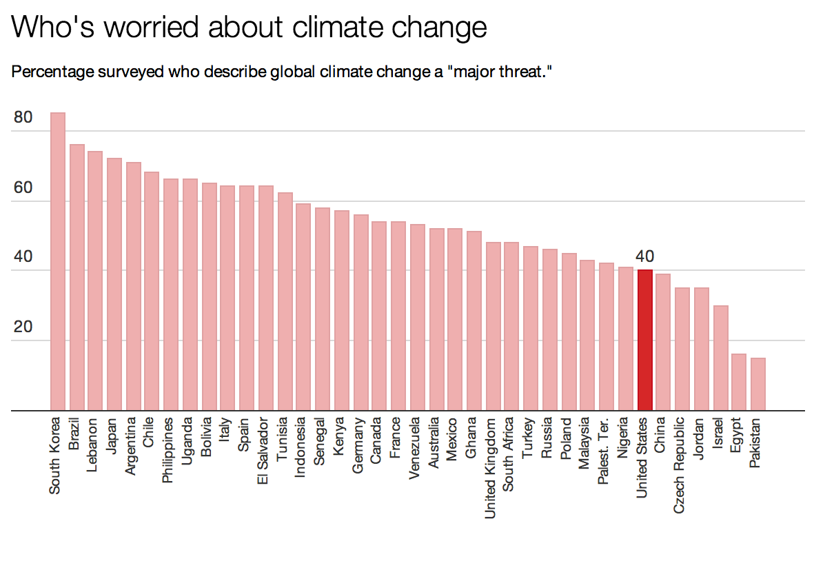 According to Pew, 40 percent of Americans call climate change a “major threat.” The people most concerned about climate change are the Greeks, 87 percent of whom call it a major threat; so do 85 percent of South Koreans, 76 percent of Brazilians and 74 percent of Lebanese. The average, among the surveyed countries, is 54 percent.