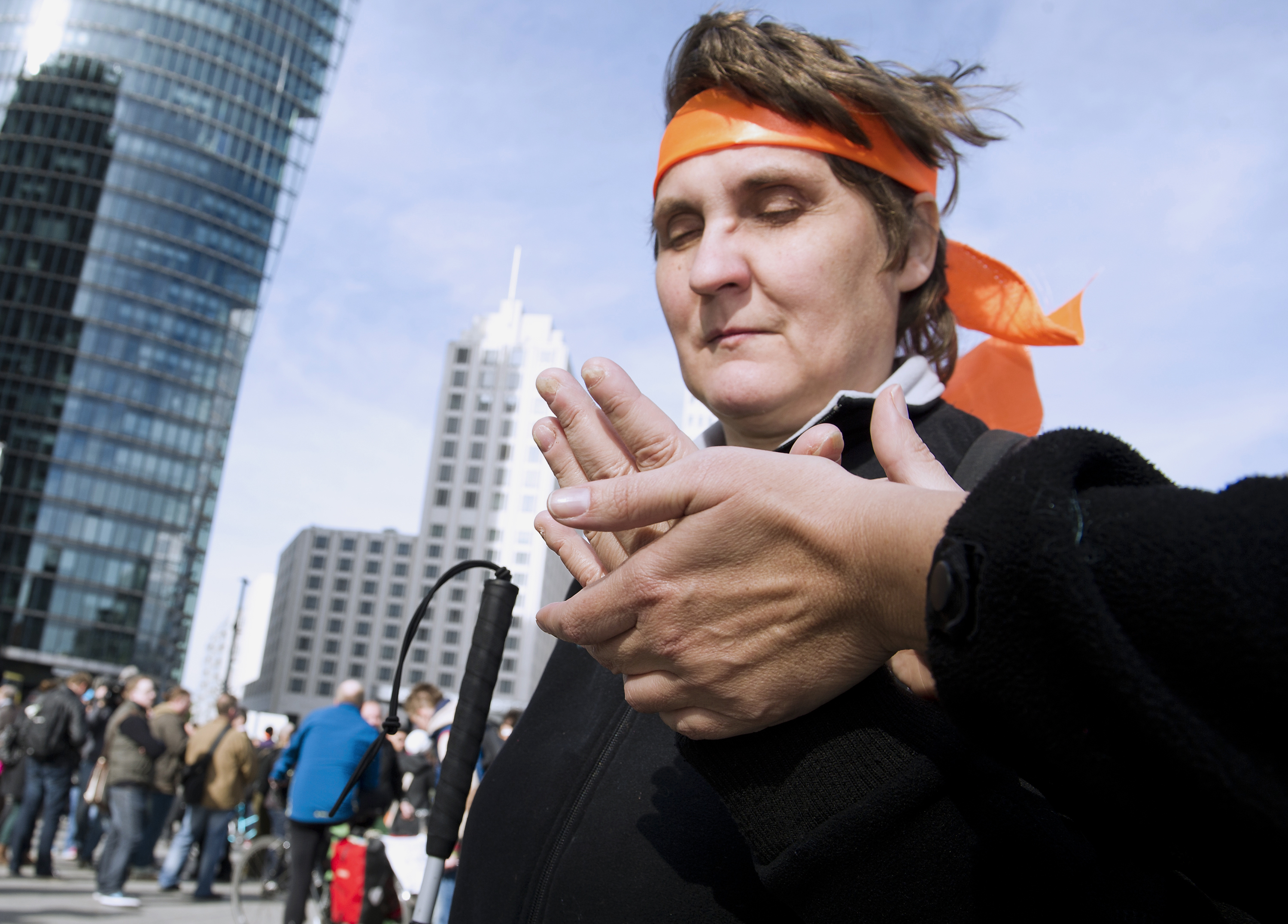 Hundreds of deaf and blind people demonstrate for more rights in Berlin, Germany on October 4, 2013. People disabled by both deafness and blindness communicate with each other with a special tactile sign language called the ‘Lorm Alphabet’. By Target Presse Agentur Gmbh/Getty Images.
