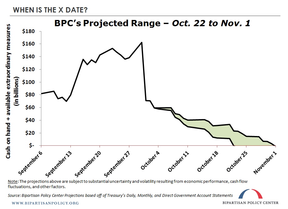 People have been talking a lot about Oct. 17. That’s the day the Treasury Department expects to exhaust ”extraordinary measures” that allow the government to finance itself without issuing Treasury bonds, such as borrowing from various government trust funds. But even when that happens, the federal government will have about $30 billion in cash left on hand, and every day it will collect more revenue. That means it will be able to go a few more days, or possibly as long as two weeks, without missing payments. The Bipartisan Policy Center has projected daily cash inflows and outflows and has narrowed the possible range for the “X date” — the first day the government can’t make all its payments due — as Oct. 22 to Nov. 1.