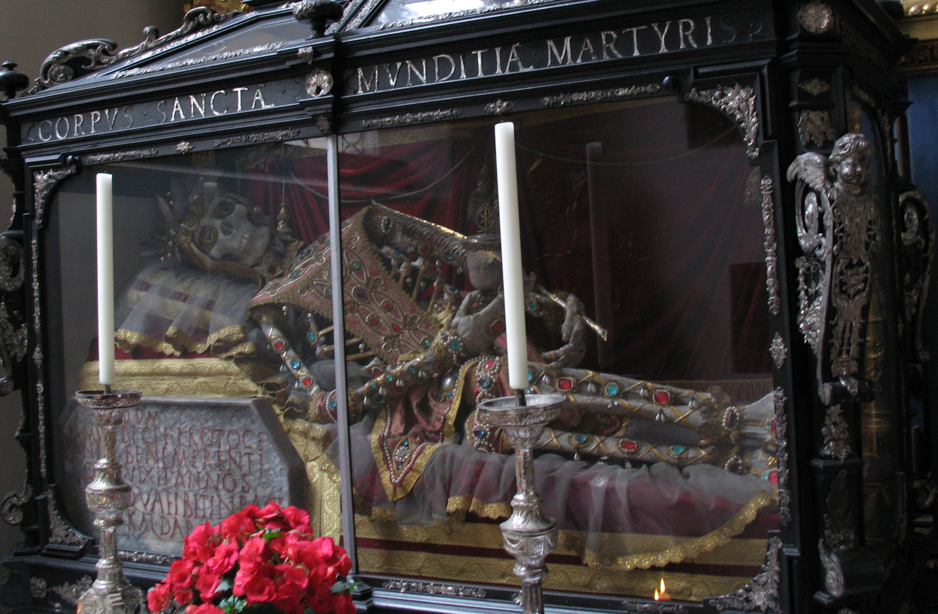 (Photo of Saint Munditia’s relics, found in St. Peter’s Church in Munich, Germany, via Wikimedia Commons)