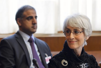 US Under Secretary for Political Affairs Wendy Sherman (R) smiles at the start of two days of closed-door nuclear talks on October 15, 2013 at the United Nations offices in Geneva. World powers and Iran began fresh talks on Tehran’s controversial nuclear programme, after a six-month hiatus over its refusal to curb uranium enrichment in exchange for easing sanctions. AFP PHOTO / POOL / FABRICE COFFRINI (Photo credit should read FABRICE COFFRINI/AFP/Getty Images)