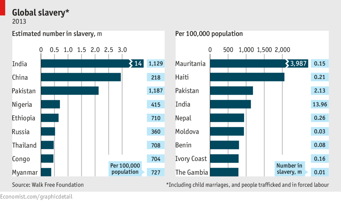 The [Global Slavery Index], published by the Walk Free Foundation on Thursday, ranks 162 countries and identifies risk factors for enslavement and the government responses. The research found that around 10 countries hold about 70 percent of the world’s slaves. India has the highest number of people enslaved in absolute terms, approximately 14 million, almost half the total worldwide.