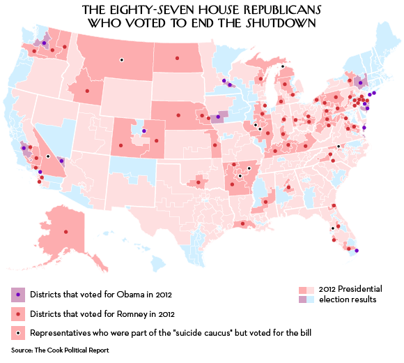 Lizza compares the GOP’s “suicide caucus,” which instigated the government shutdown, to the 87 House Republicans who voted to re-open the government, a group he dubs the “survival caucus”: