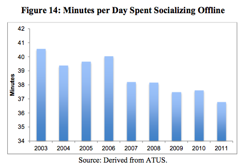“Other offline leisure activities that involve interacting with other people are crowded out by online leisure: attending parties and attending cultural events and going to museums are all negatively correlated with online leisure,” he writes. “In short, these results based on ATUS data suggest that a cost of online activity is less time spent with other people.”