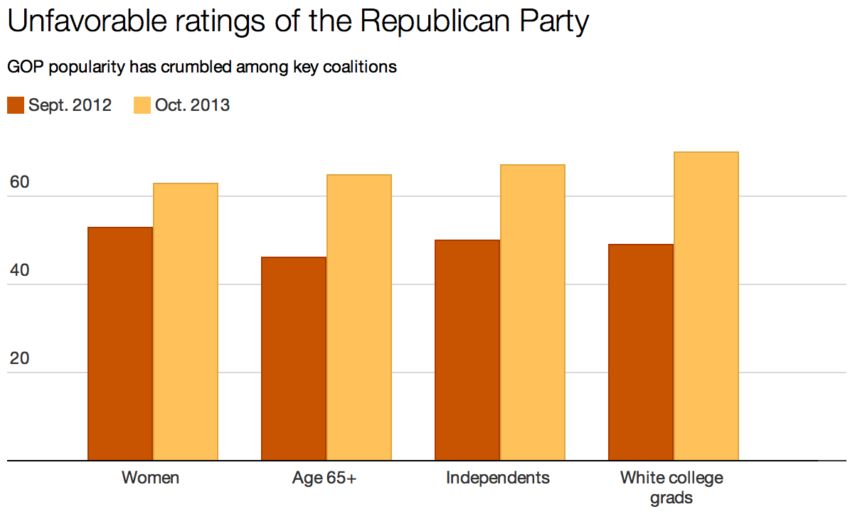 Polling released this week by the Washington Post and ABC News found the GOP’s unfavorability ratings among Americans at an all-time high of 63 percent. But a closer look at the numbers reveals that this has been accompanied by a massive collapse in 2013 of the GOP brand among core constituencies important in midterm elections: Independents, women, and seniors. The crack Post polling team has produced a new chart demonstrating that in the last year — since just before the 2012 election – there’s been a truly astonishing spike in the GOP’s unfavorable ratings among these core groups