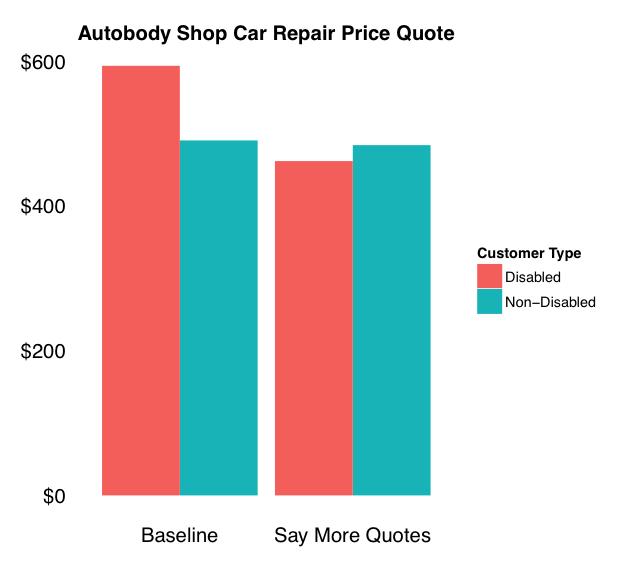 Curious about the extent to which car repairman were motivated by hatred or just profit motive, though, we did one run of the experiment where both types of our secret agents got a quote and told the repairman that they were, “getting three price quotes today.” What did this extra sentence do? Well the figure shows that for the able-bodied subjects, their price quotes didn’t change at all, but for the disabled they plummeted. Furthermore, the difference in prices for the disabled and abled disappeared.