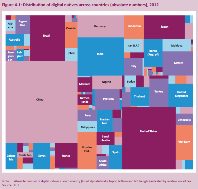 As you might expect, impoverished and war-torn nations have the lowest proportion of digital natives, a fact that could make the global economic playing field even less even going forward. Digital natives make up less than 5 percent of the youth in Afghanistan, Nepal, Iraq, Ethiopia, Bangladesh, and many other countries across south Asia, central Africa, and parts of the Middle East. “This is fundamental to a country’s economic and social development and their participation in an information network society,” [researcher Michael] Best said. “In these conflict-stressed and developing countries, the report suggests that further attention to Internet infrastructure and capacity are critical to their economic development.”