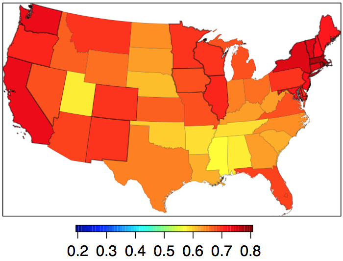 Nearly all recent opinion polls indicate that a large majority of the American public — more than 70 percent — supports efforts to make employment discrimination against gay men and and lesbians illegal. Of course, these national numbers are not what the senators are likely to care about. However, when we use national polls to estimate opinion by state, we find that majorities in all 50 states support ENDA-like legislation (note that in 1996, majorities in only 36 states supported ENDA). Today, public support ranges from a low of 63 percent in Mississippi to a high of 81 percent in Massachusetts.
