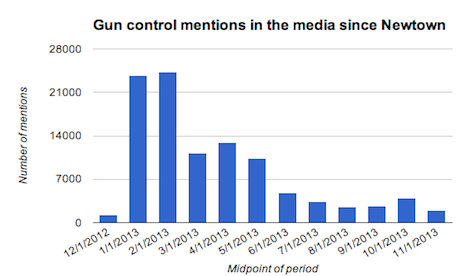 The problem is that the media ended up switching gears. In this 24-hour news cycle, it was only a matter of time before there was something new happening. Check out how the number of news stories dropped off since the second month after Newtown.