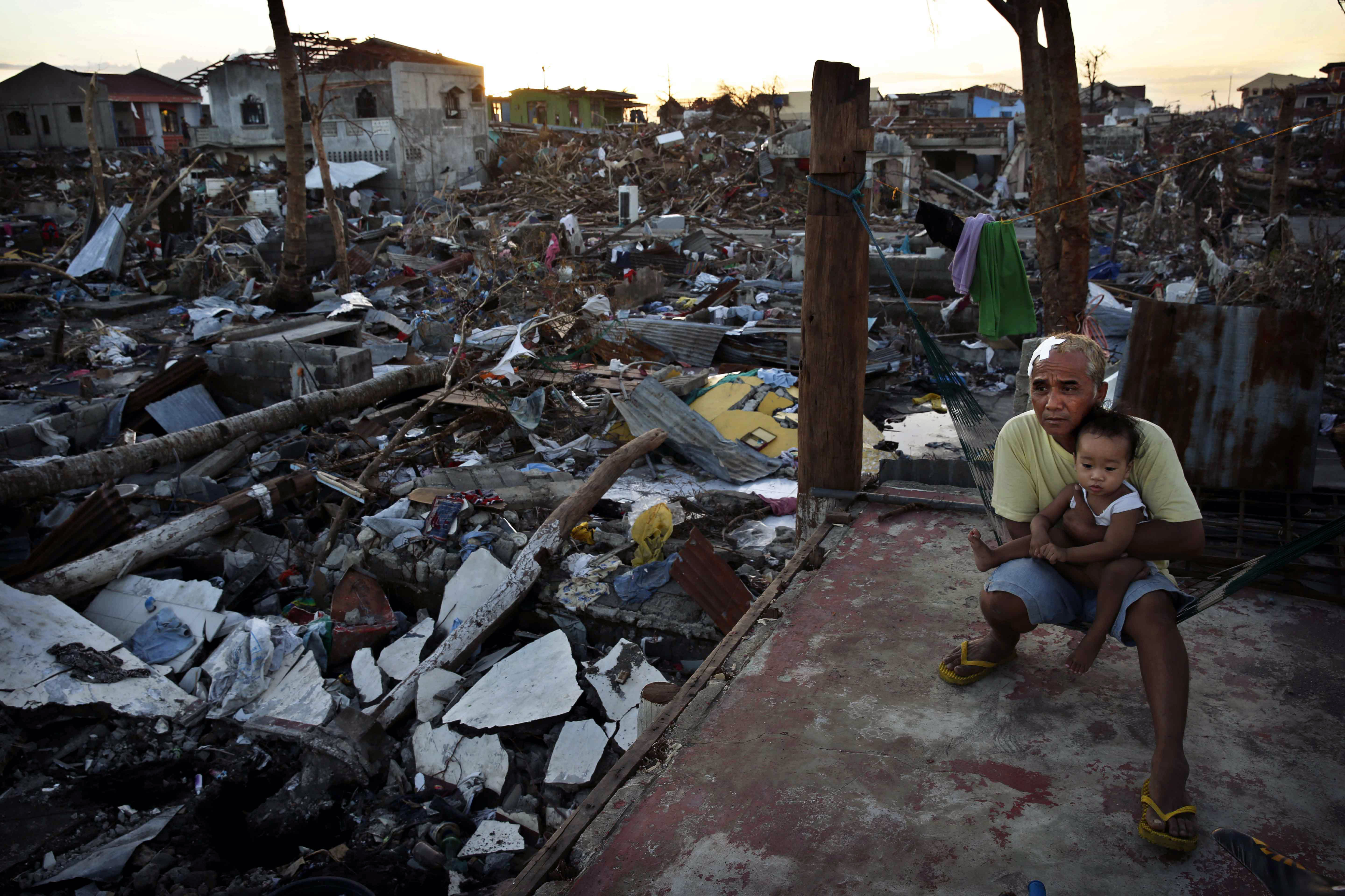(Photo: Zosimo Moabando sits with his young grandson Kyle on the roof of their damaged house in the devastated town of Tanuan, south of Tacloban, on November 15, 2013 in Philippines. By Kevin Frayer/Getty Images)