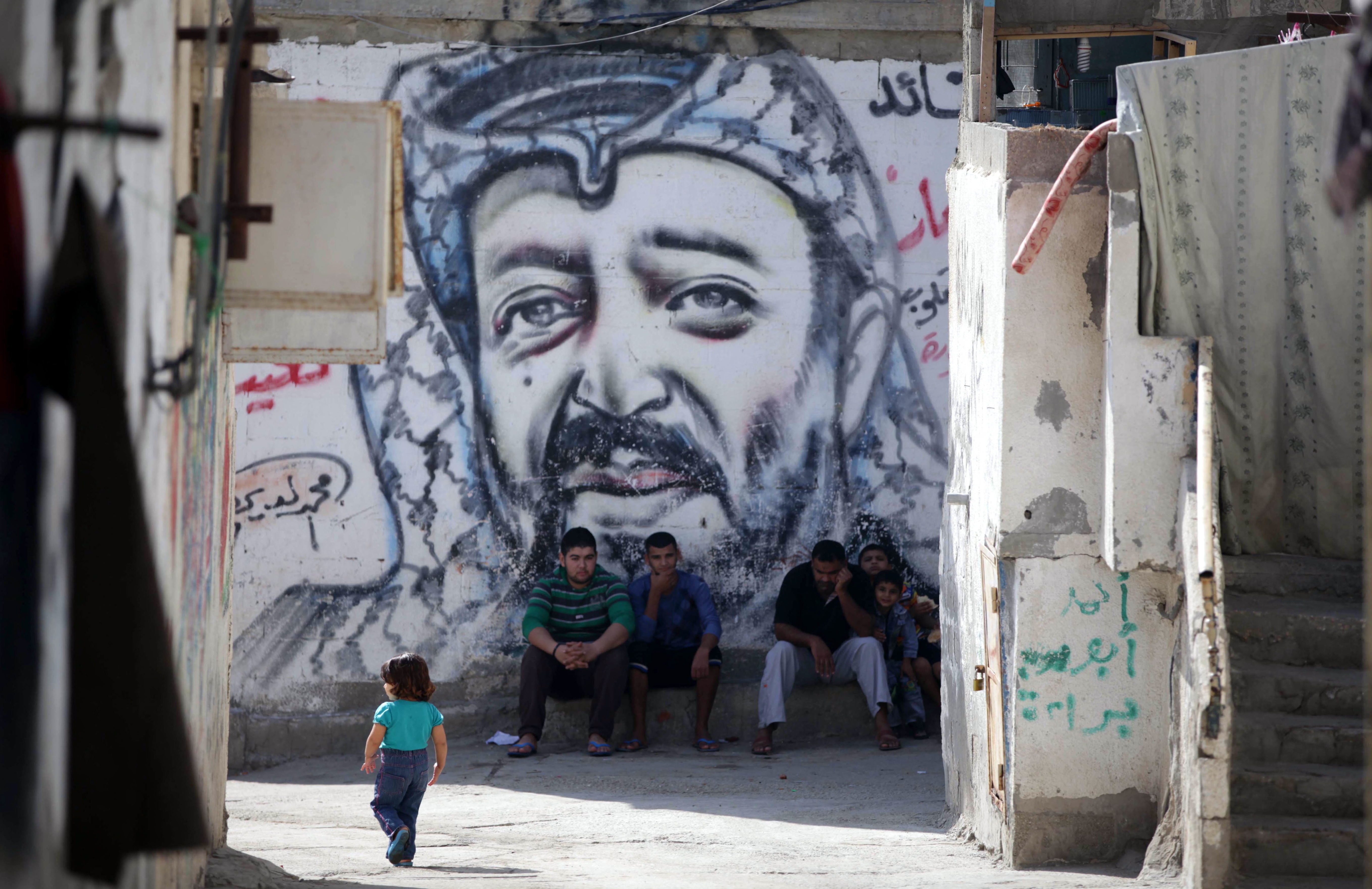 (Photo: Palestinian youth sit in front of a mural of the late Palestinian leader Yasser Arafat, at al-Shati refugee camp, as Palestinians mark the ninth anniversary of his death, in Gaza City on November 11, 2013. Arafat died in Paris on November 11, 2004 at 75 after falling sick a month earlier. Doctors were unable to specify the cause of death and no post-mortem was carried out at the time. By Ashraf Amra/Anadolu Agency/Getty Images)