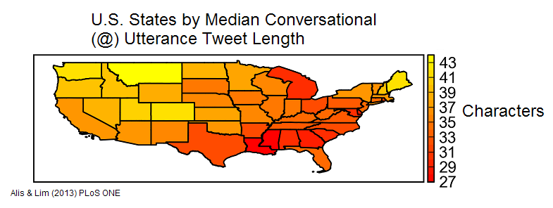 Broadly speaking, yes – at least in terms of English-language tweets. The slope of the decline was similar in the USA and in tweets originating from the rest of the world. However within the US, [researchers Christian M.] Alis and [May T.] Lim found a remarkable state-by-state variability (Bear in mind however that few tweets have geolocatable info, so the sample sizes,and representativeness, of these data here are lower)… The average @ utterence from Louisiana is just 27 characters, compared to 43 in Montana.