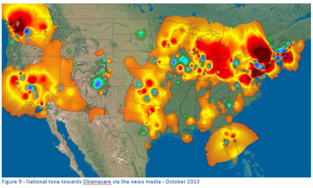 We can also gaze through the eyes of the news media and literally map the deep pessimism towards the law as it spreads across the nation. This by itself is a key finding: just how much the media has been covering Obamacare and, in particular, how key the GOP’s tying of Obamacare to the government shutdown was in bringing it to the forefront.