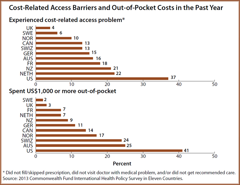 In 2013, more than one-third (37%) of U.S. adults went without recommended care, did not see a doctor when they were sick, or failed to fill prescriptions because of costs, compared with as few as 4 percent to 6 percent in the United Kingdom and Sweden.