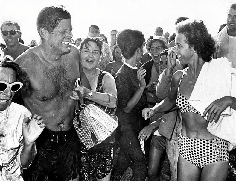 This photo is a family heirloom. Our family friend Ruth is the woman right of center with the glasses and hat, and the arm in the tan sweater behind the woman in the bikini is our recently lamented Aunt Dorothy. The picture was taken in Santa Monica after the 1960 election, before JFK’s term began. He’s just out for a swim at the beach. In the context of modern security, this scene is astounding.