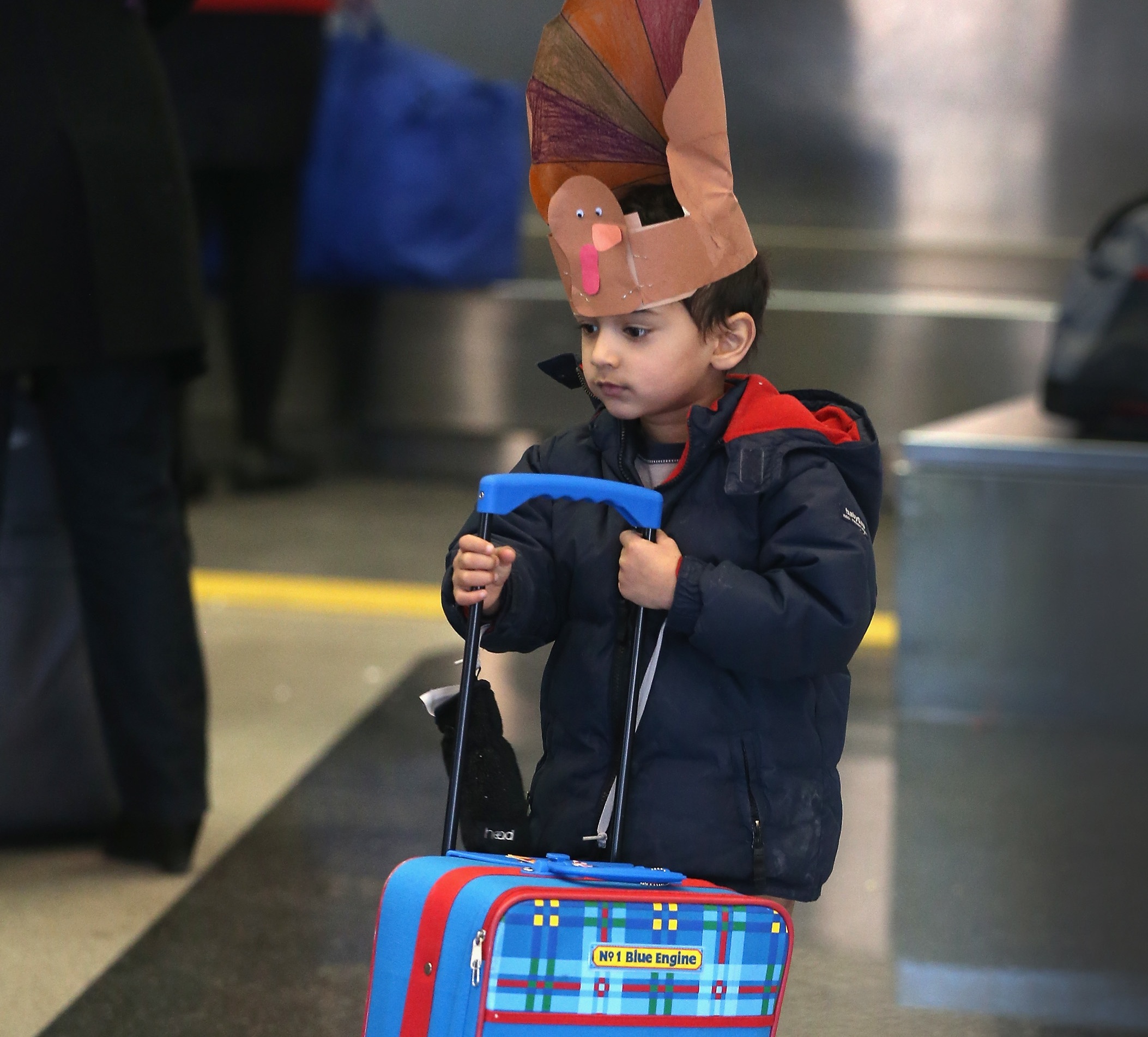 Rabi Chandra, 4, waits as his parents check in for a flight at O’Hare International Airport in Chicago, Illinois on November 27, 2013. Nearly 1.5 million travelers are expected to fly through O’Hare over an eight-day Thanksgiving holiday travel period that ends December 3, according to the city’s Department of Aviation. A wintry storm system covering much of the nation is threatening to wreak havoc on holiday travel, especially in the South and Northeast. By Scott Olson/Getty Images.