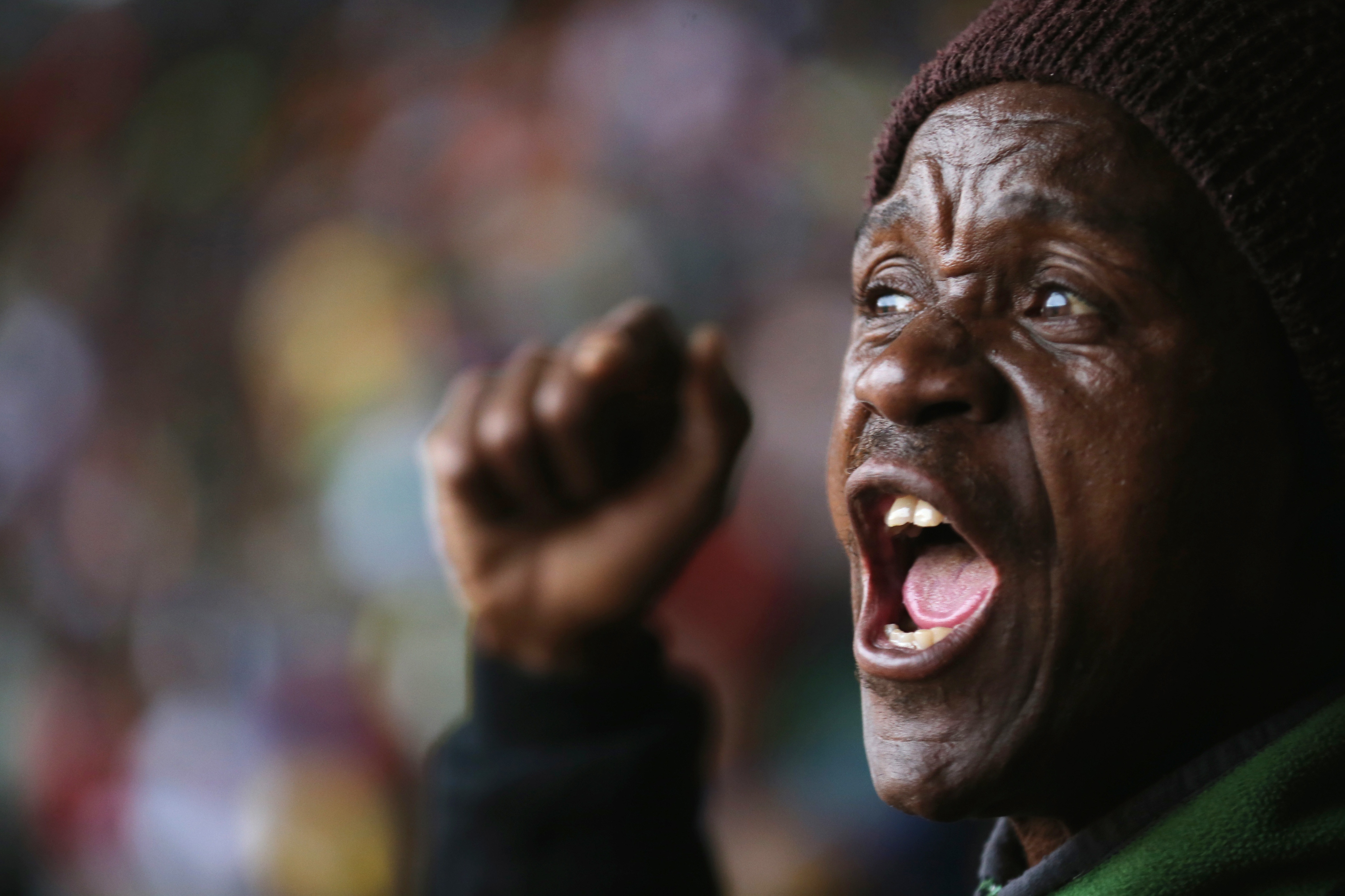 A man sings passionately as he waits for the Nelson Mandela memorial service at the FNB Stadium in Johannesburg, South Africa on December 10, 2013. Over 60 heads of state have travelled to South Africa to attend a week of events commemorating the life of former South African President Nelson Mandela, who passed away on the evening of December 5, 2013 at his home in Houghton at the age of 95. Mandela became South Africa’s first black president in 1994 after spending 27 years in jail for his activism against apartheid in a racially-divided South Africa. By Christopher Furlong/Getty Images.