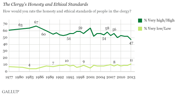 Americans are divided along party lines, as well as age. Gallup found more trust in clergy among Republicans (63%) than Democrats (40%). Similarly, clergy members appear more trustworthy to older Americans than millennials: half of Americans older than age 55 trust clergy members, while only 32 percent of millennials (18 to 34 years) report the same.