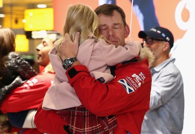 LONDON, ENGLAND – DECEMBER 23: Walking with the Wounded team member Duncan Slater is embraced by his daughter Lilly on his return to London Heathrow’s terminal 3 on December 23, 2013 in London, England. The South Pole allied expedition comprised of three international teams made up of wounded servicemen and women from the UK, the US and the Commonwealth (Australia and Canada) trekking across 335km of the Antarctic Plateau to reach the South Pole in 16 days. (Photo by Dan Kitwood/Getty Images)