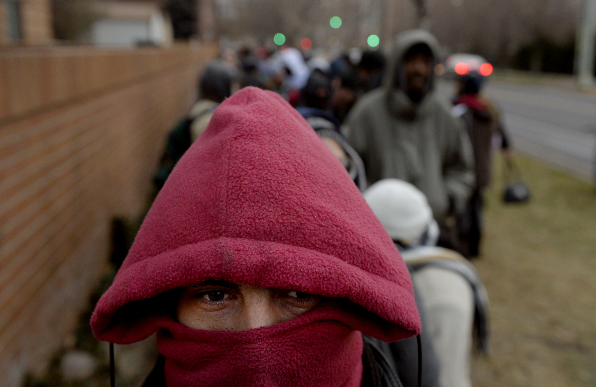 Vincent Herman waits in line during the Father Woody money giveaway at the Cathedral Basilica of the Immaculate Conception in Denver, Colorado. Herman said, “I’m having a rough time trying to find a job, this is great.” More than 1,000 people, some of them homeless, all of them struggling, circled a Capitol Hill block Friday morning, waiting in the gray, freezing cold so they could pocket $20 in an annual Christmas event started by the late Monsignor Charles B. Woodrich. By Craig F. Walker/The Denver Post/Getty.
