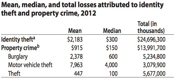 much as property crime, that’s an odd omission. In a recent report, the U.S. Bureau of Justice Statistics found that total losses attributed to identity theft in 2012 were $24.6 billion, compared to $13.9 billion for property crimes. Not only is the total loss amount higher for identity theft, the mean and median loss per incident is roughly double (see the chart at right).